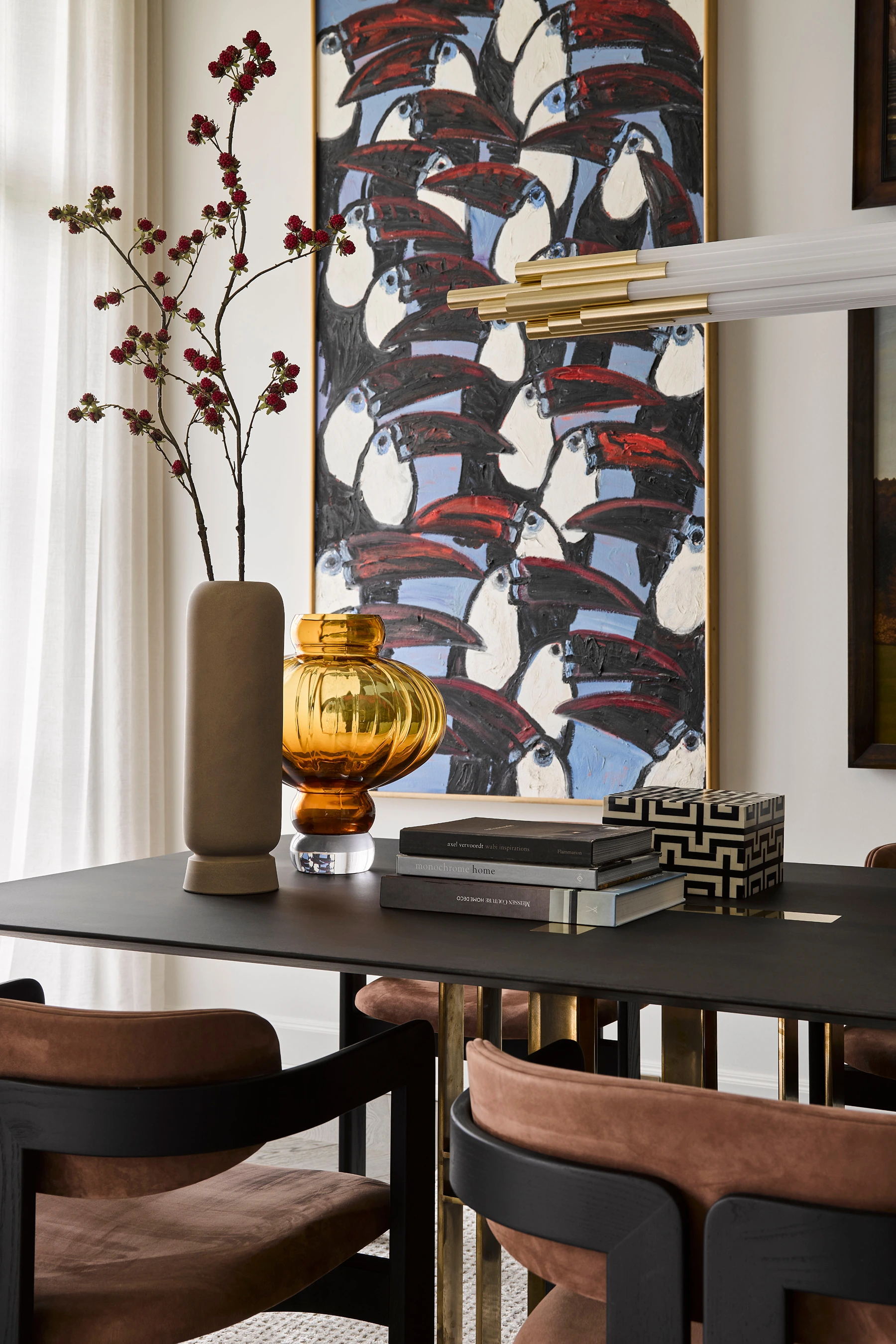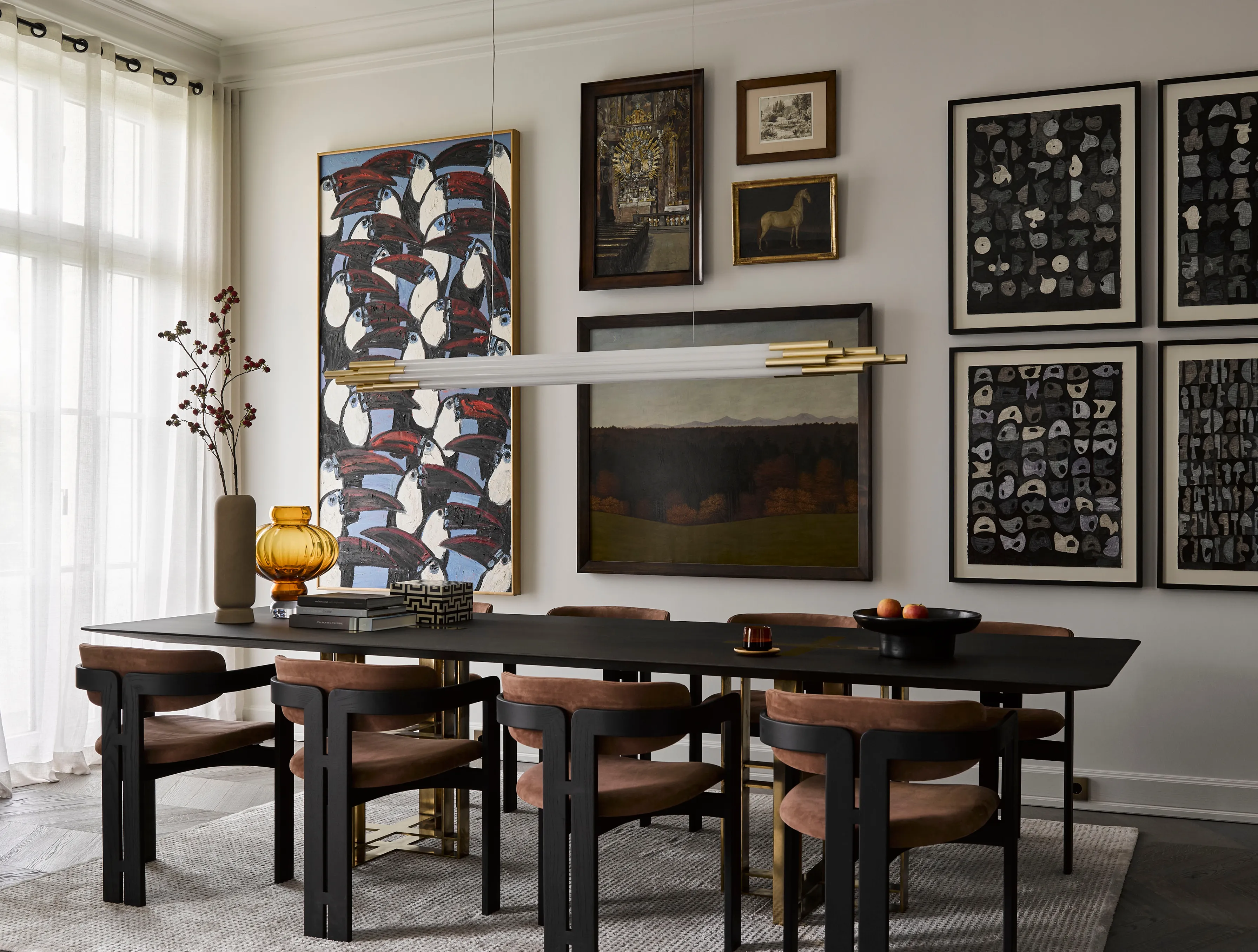 Die Wohnung wurde von innen und außen neu gedacht. Klassische Elemente wie Parkett und kunstvoller Stuck bilden die Grundlage und verleihen den Räumen Tradition und Beständigkeit. Ergänzt wird dieses architektonische Fundament durch moderne, individuell gefertigte Möbelstücke und hochwertige Designobjekte, die den aktuellen Zeitgeist aufgreifen und gleichzeitig eine eigene stilistische Handschrift tragen.