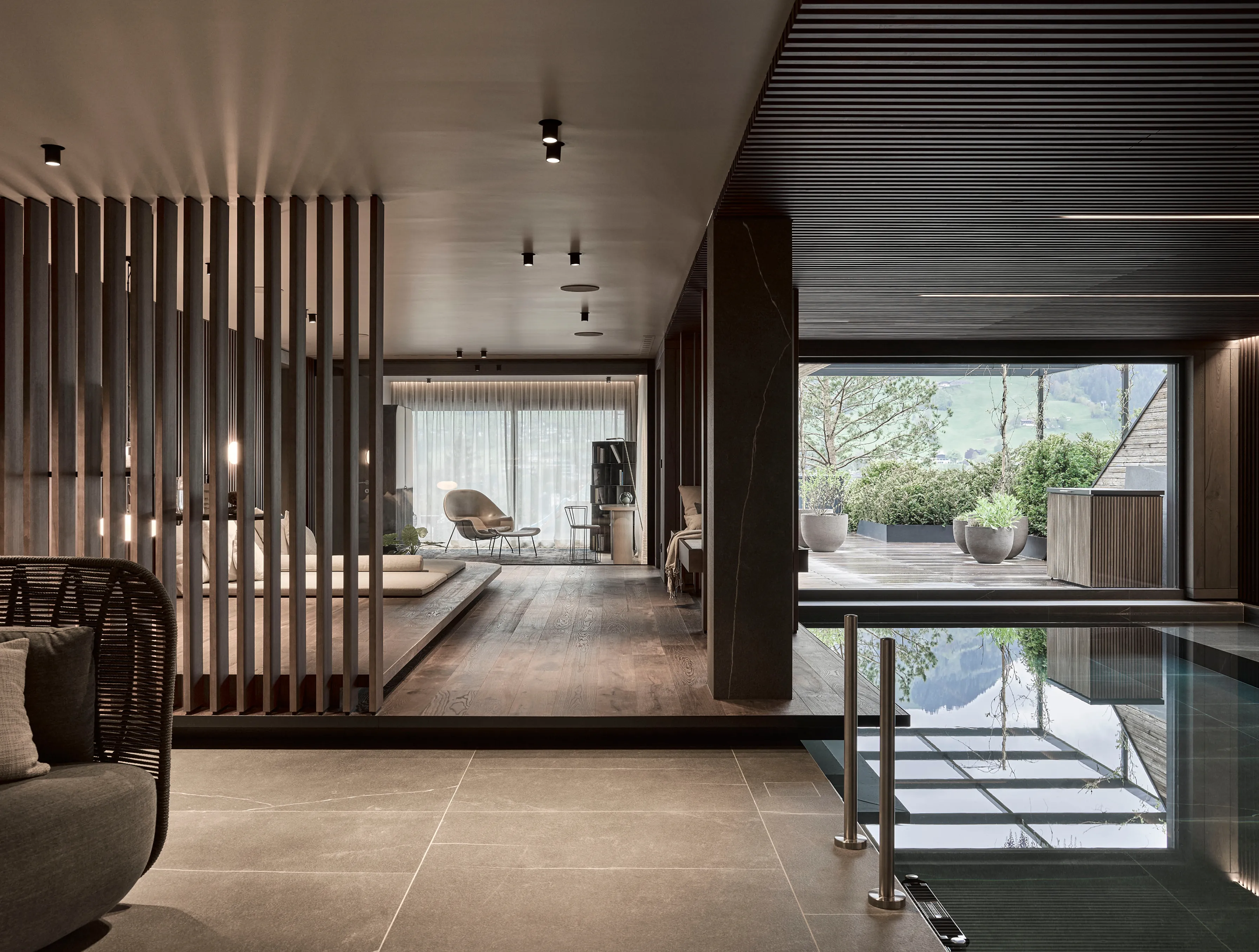 Die Gestaltung folgt einer klaren Linie: natürliche Materialien, durchdachte Raumflüsse und eine reduzierte Formensprache, die den Blick auf das Wesentliche lenkt – im Innen wie im Außen.