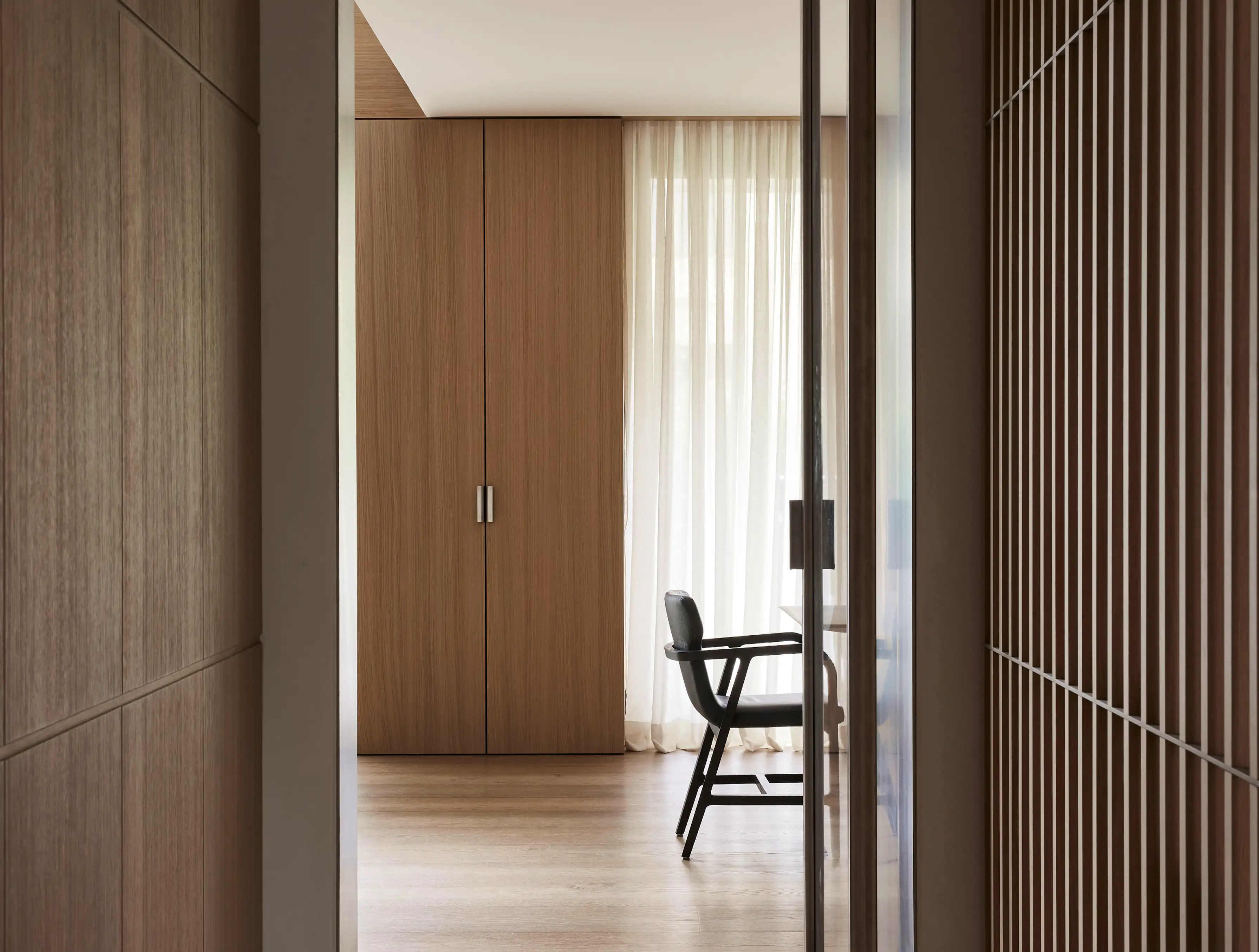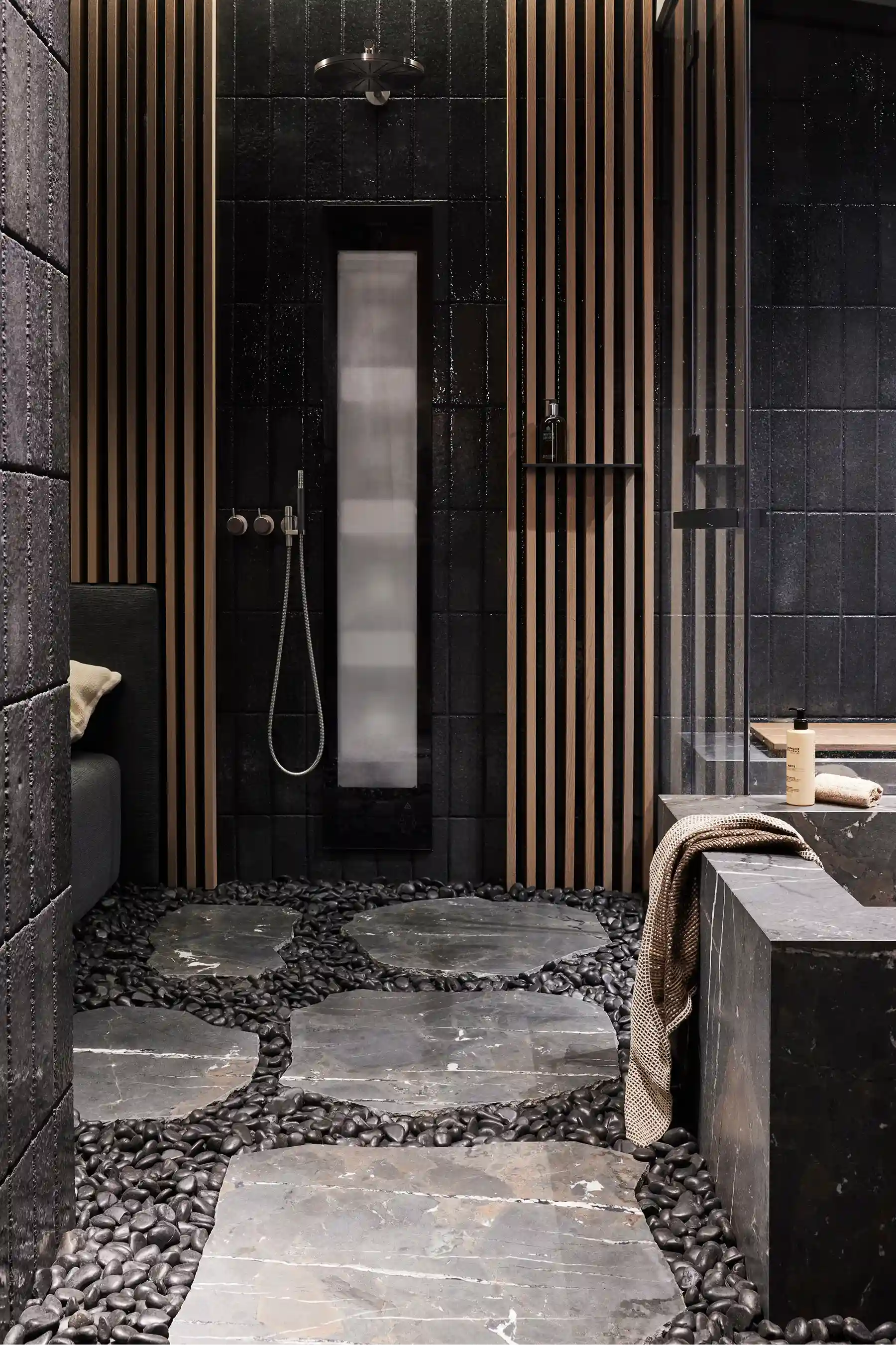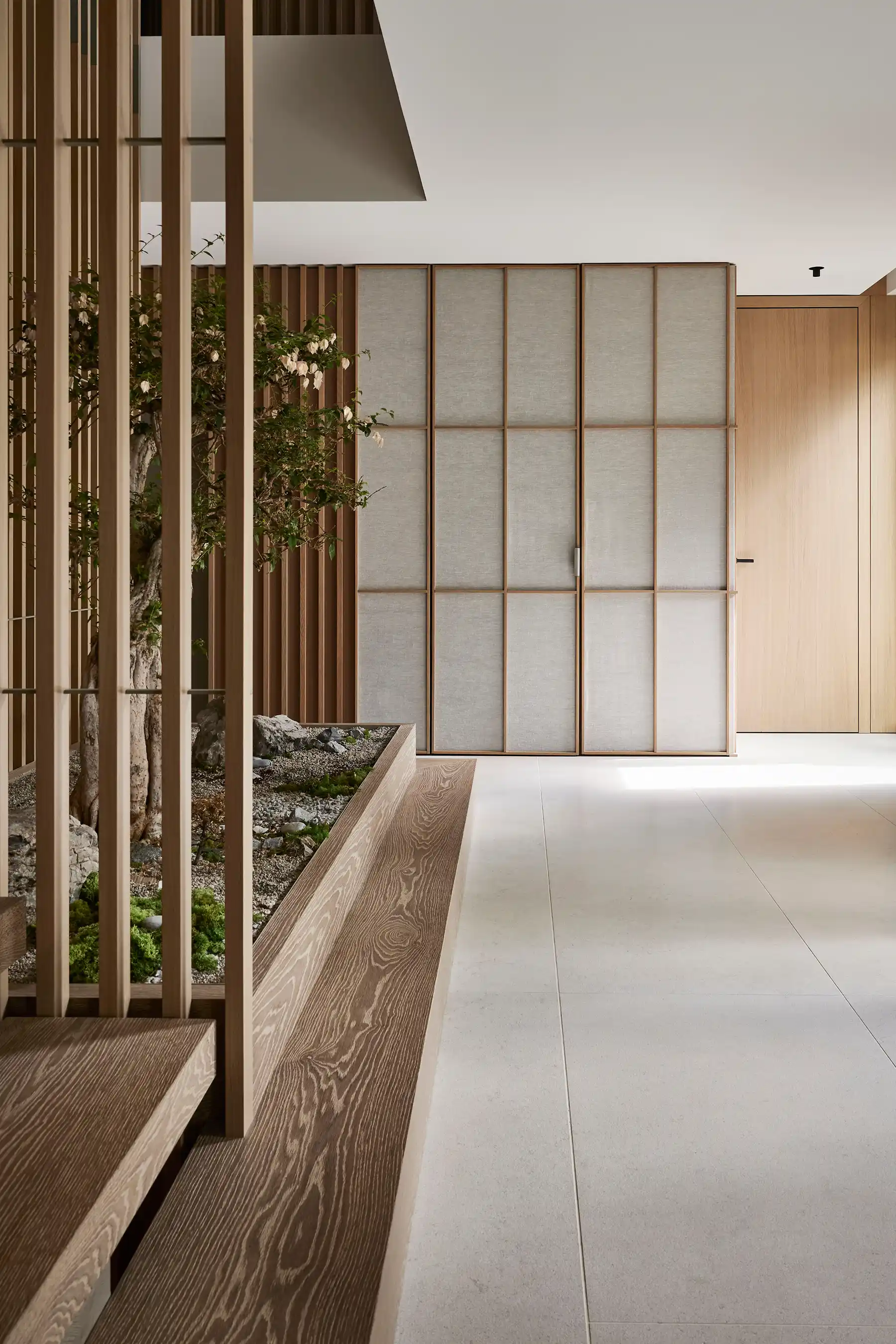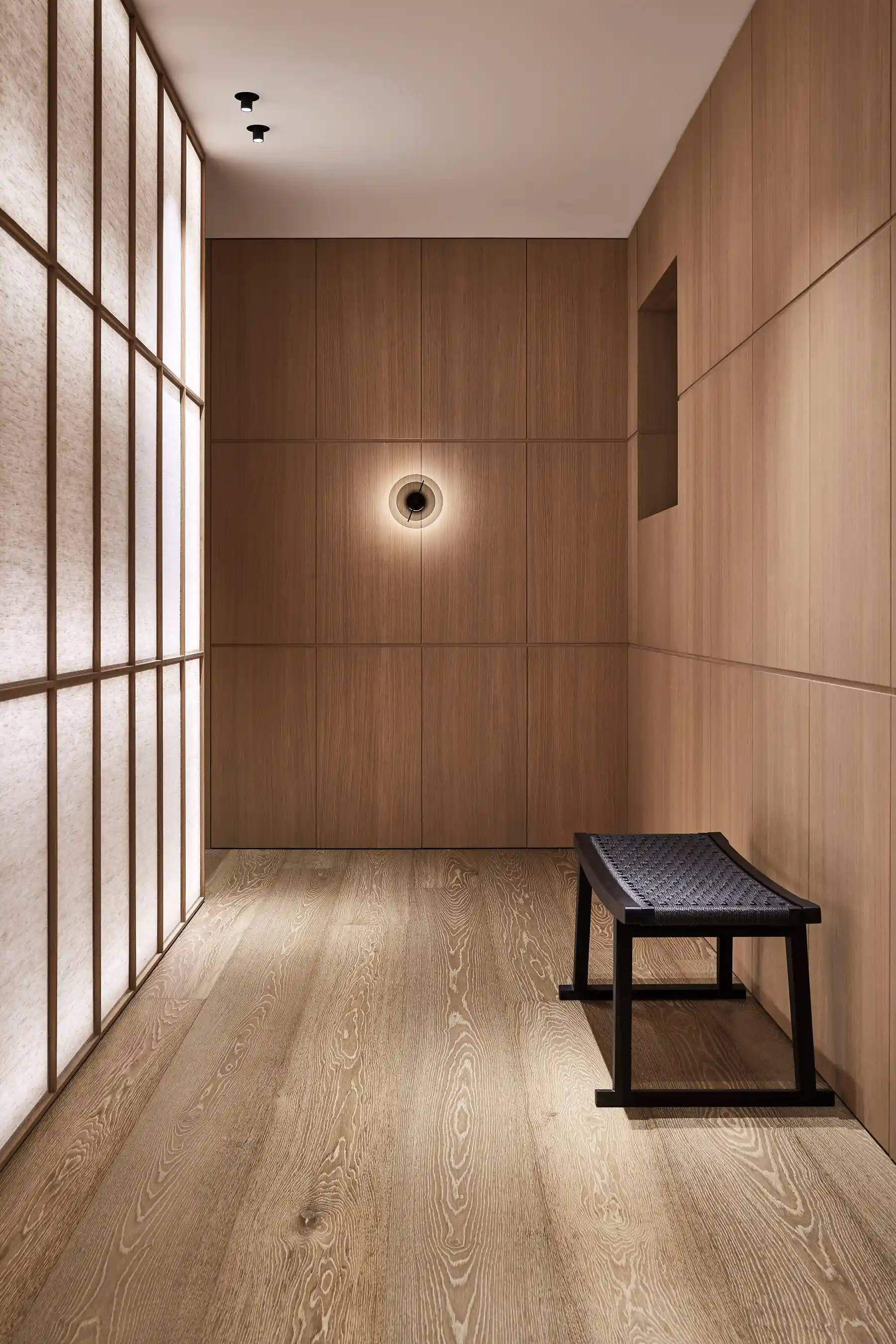 Die Innenarchitektur lebt von präzisen Linien, dem bewussten Verzicht auf Dekor und dem intelligenten Einsatz natürlicher Materialien. Holz, Stein und textile Oberflächen sind so gewählt, dass sie Tiefe, Wärme und stille Gastfreundschaft ausstrahlen – ohne die visuelle Ruhe zu stören.