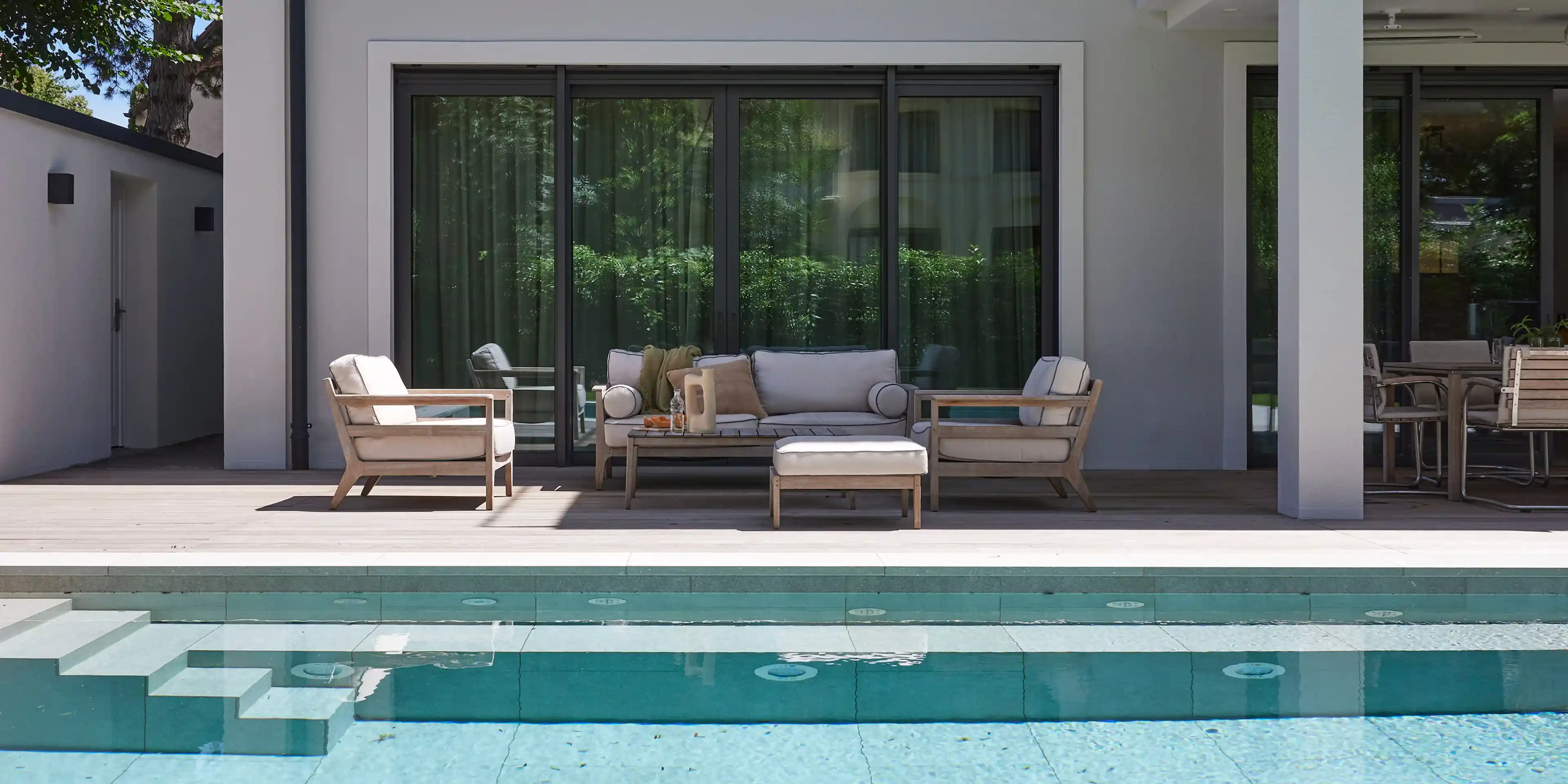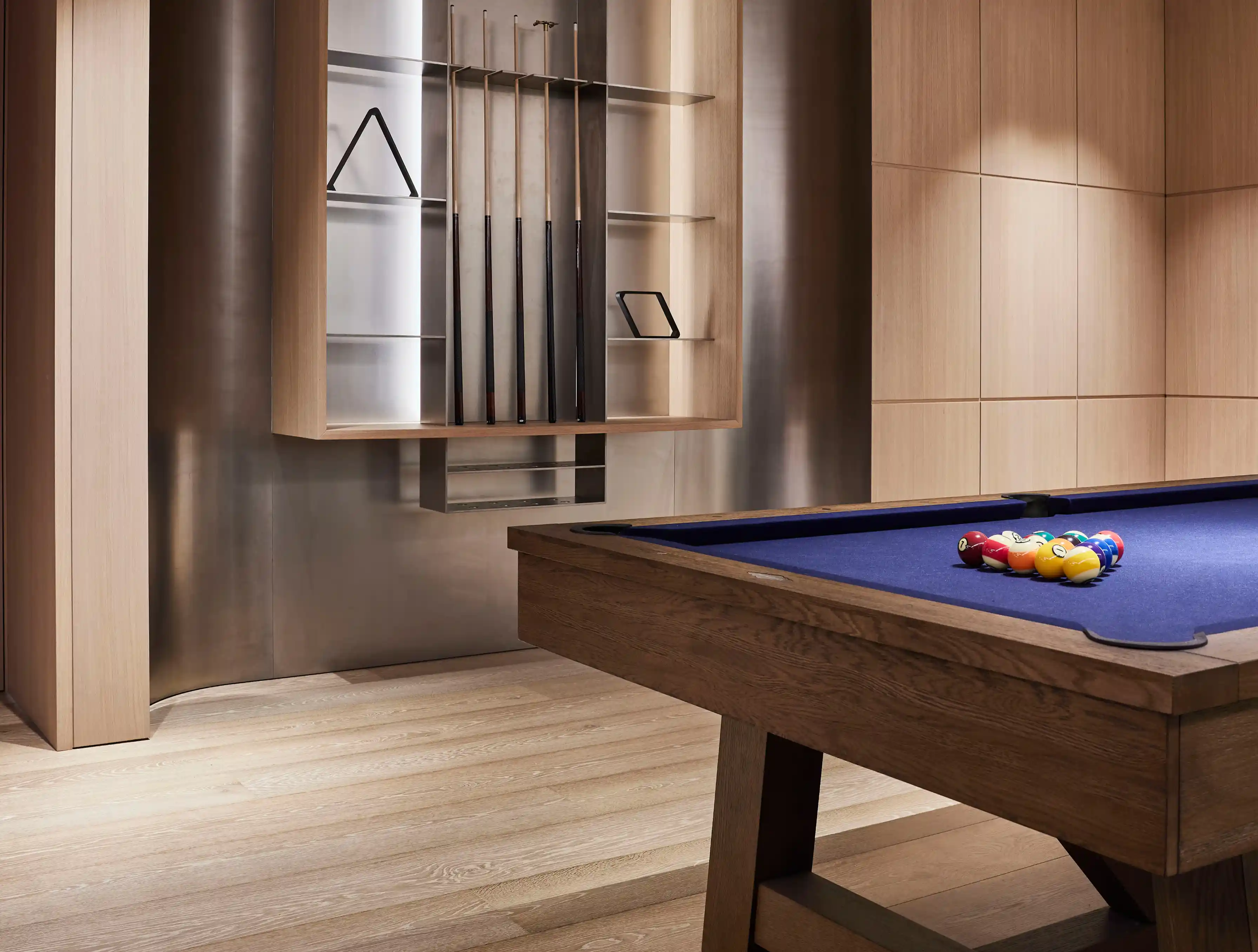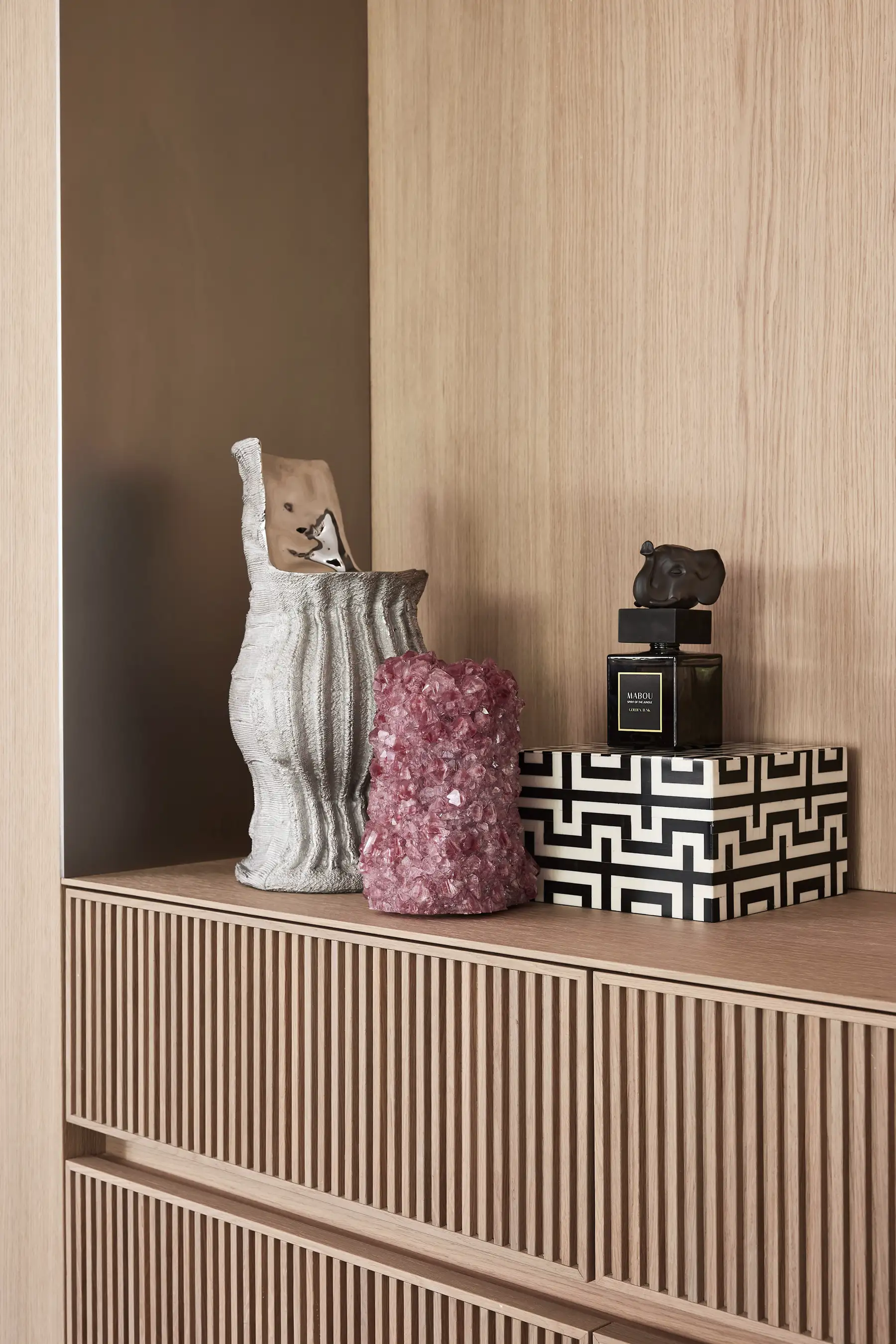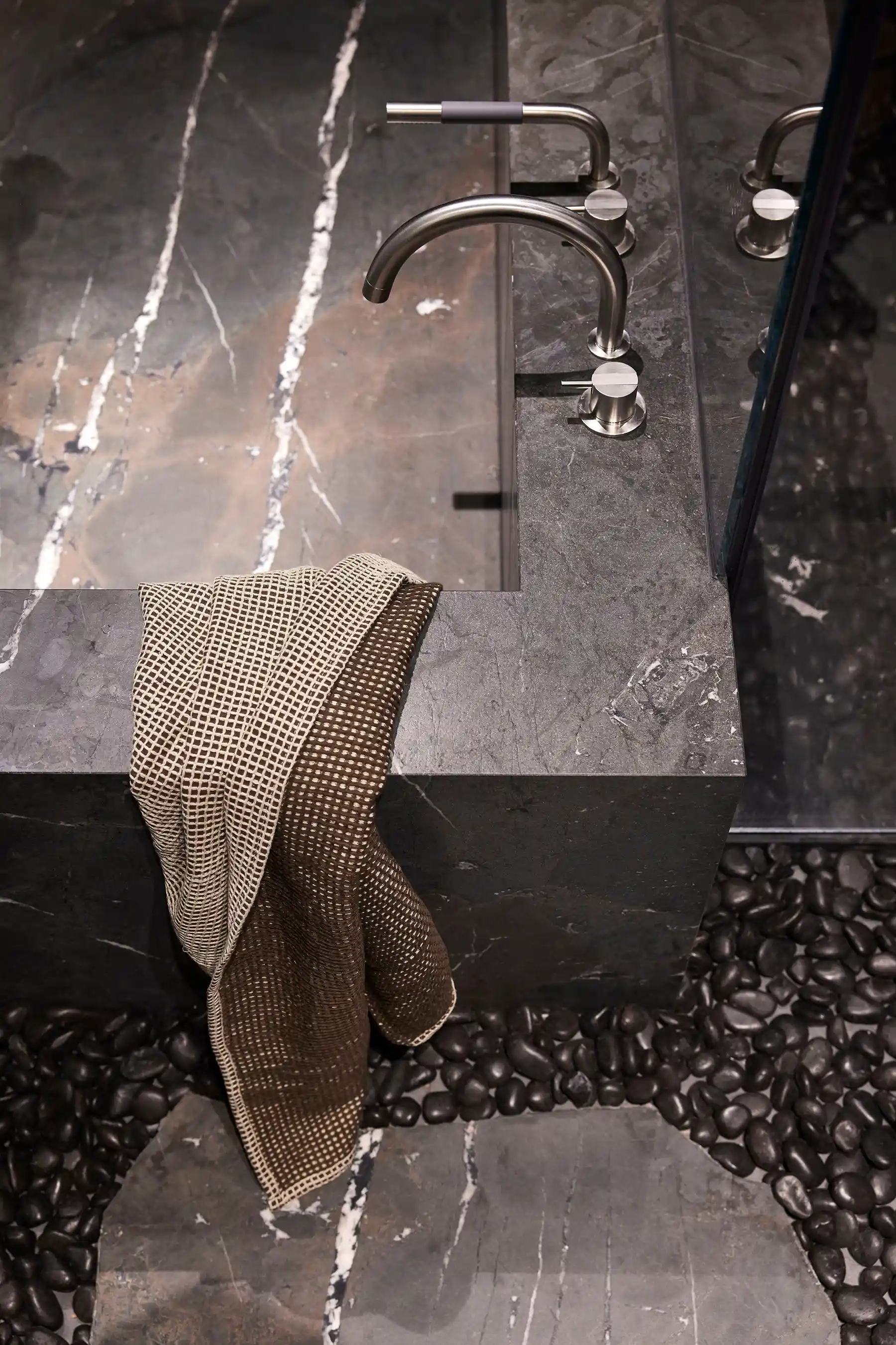 Die Innenarchitektur lebt von präzisen Linien, dem bewussten Verzicht auf Dekor und dem intelligenten Einsatz natürlicher Materialien. Holz, Stein und textile Oberflächen sind so gewählt, dass sie Tiefe, Wärme und stille Gastfreundschaft ausstrahlen – ohne die visuelle Ruhe zu stören.