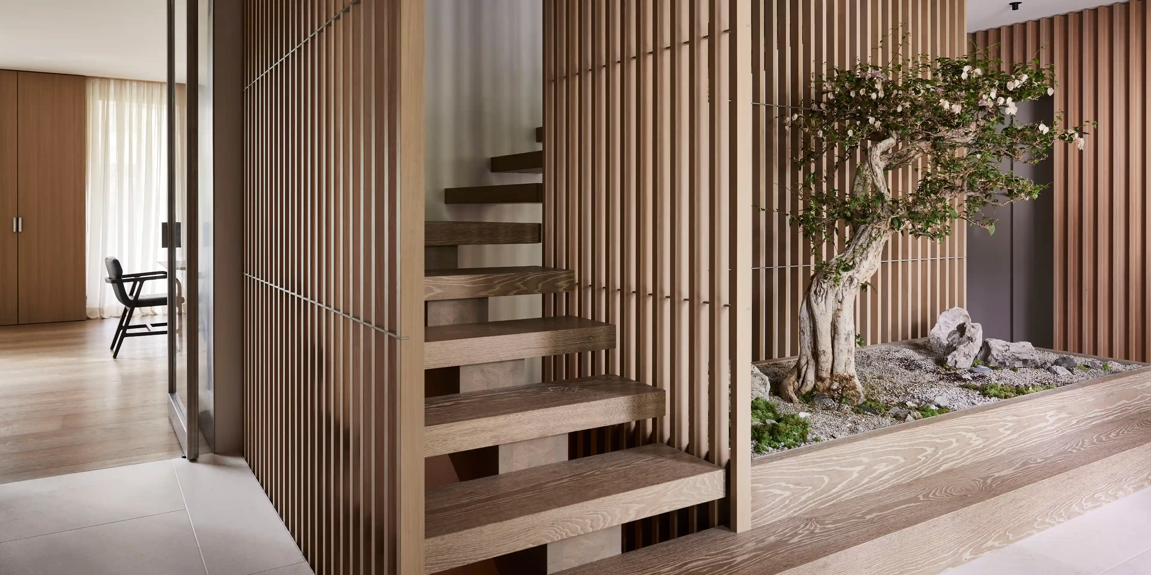Im Herzen des eleganten Münchner Stadtteils Bogenhausen entstand eine zeitlose Villa, die sich durch ihre klassische Außenarchitektur harmonisch in das historische Umfeld einfügt. Doch hinter der traditionellen Fassade offenbart sich ein völlig anderes Wohnkonzept: reduzierter Minimalismus mit japanischem Einfluss, maßgeschneidert auf die Persönlichkeit und Lebensweise der Bewohner. Auf besonderen Wunsch der Bauherren wurde ein echter Bonsai im Eingangsbereich gepflanzt, der Ausgangspunkt für die weitere Gestaltung des imposanten Treppenhauses war.